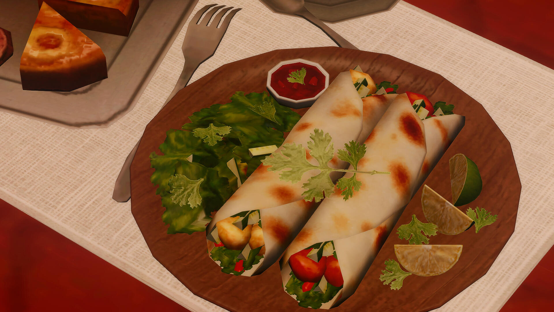 A traditional Thavnairian appetizer. Finely chopped dark eggplant spiced with ground cumin, garlic, and paprika mixed with perilla oil—all sourced from the residents of Palaka's Stand. Served with naan and chopped vegetables