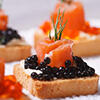 An hors d'oeuvre staple at lavish social gatherings. Comprised of eggs from the rare caviar sturgeon, and flaky, tender meat of the lordly salmon delightfully set atop a humble bite-sized bread.