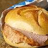 Several slices of high quality ground liver loaf and cheese sandwiched between two halves of kaiser roll.