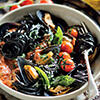 A tangy dish of thin noodles tossed with squid ink, herbs, blood tomato sauce, and the largest, juiciest of shrimp.
